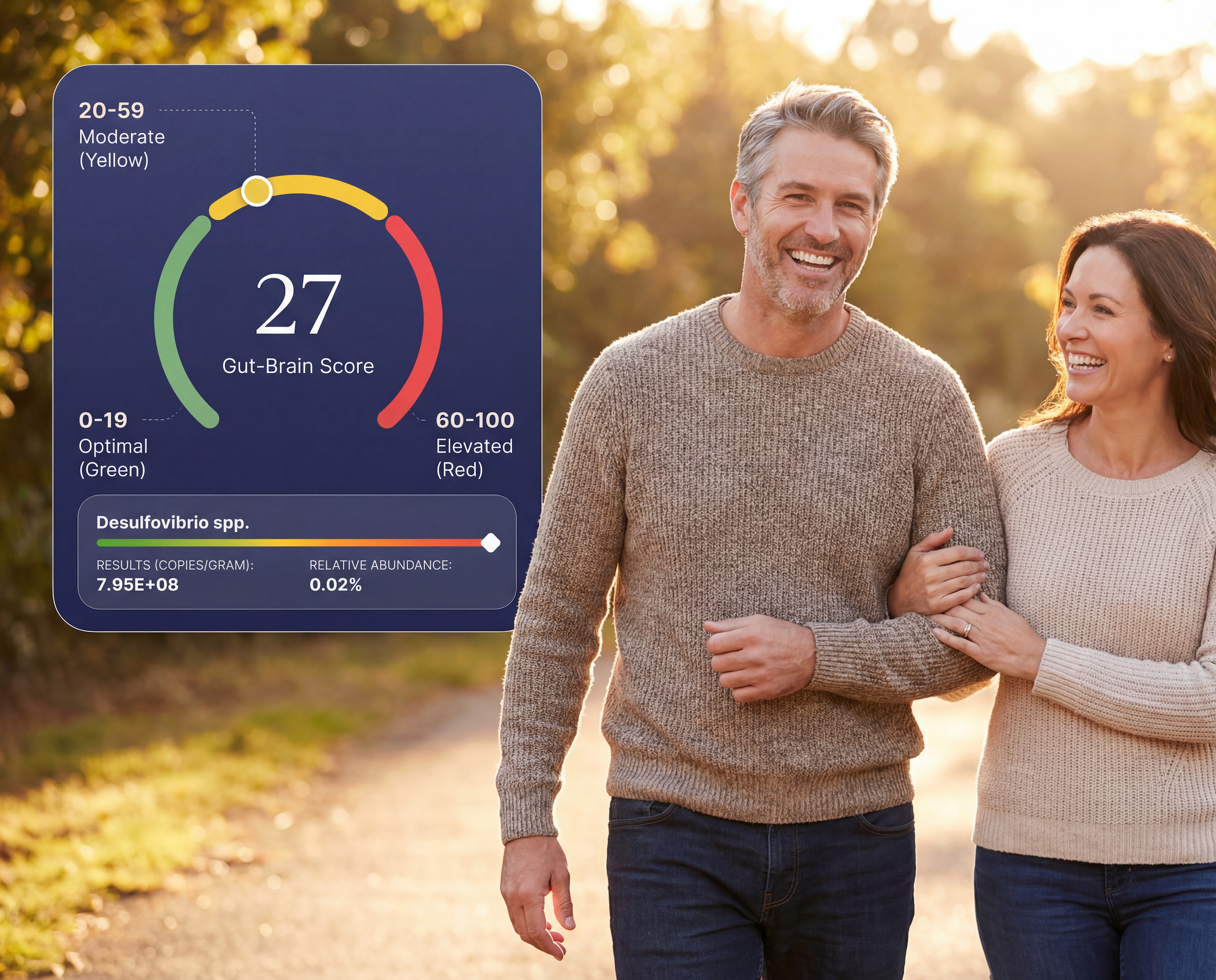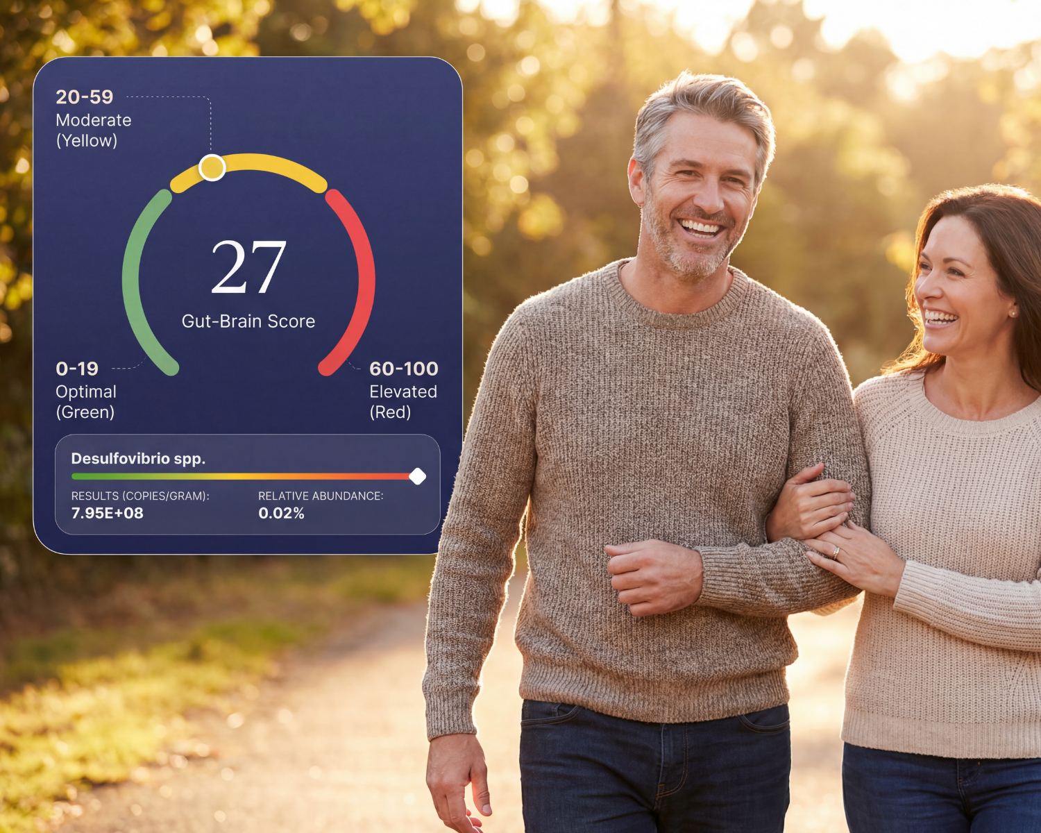Your Gut-Brain Wellness Score ranges from 0 to 100. It combines your bacterial analysis with a lifestyle assessment. Lower scores are better: 0–19 is Optimal, 20–59 is Moderate, and 60–100 is Elevated.