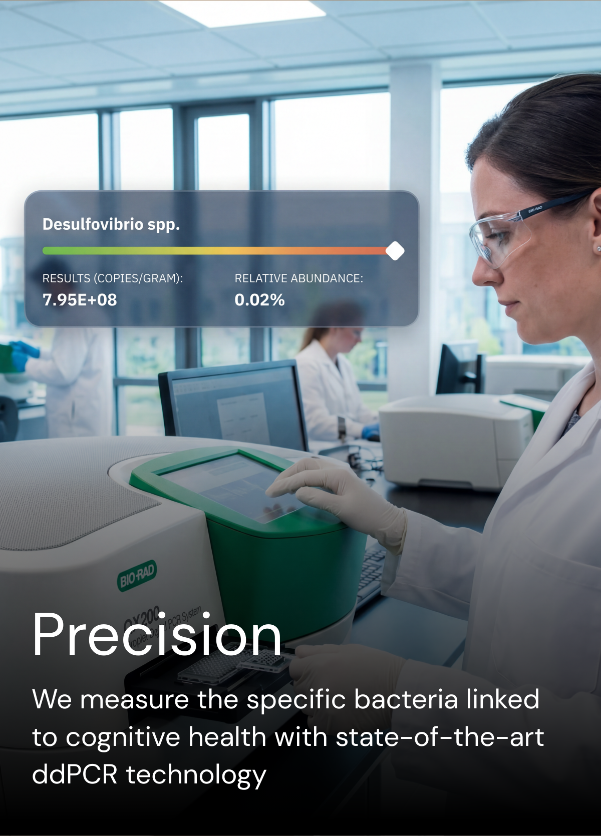 Most microbiome tests use standard sequencing to scan hundreds of bacteria and deliver a broad report. Cervco uses ddPCR (Digital Droplet PCR) — a far more precise technology that provides absolute quantification of the specific bacteria linked to brain health. We go deep on what matters for your brain instead of casting a wide net.